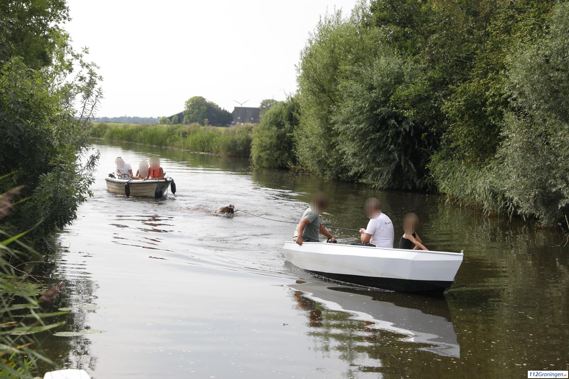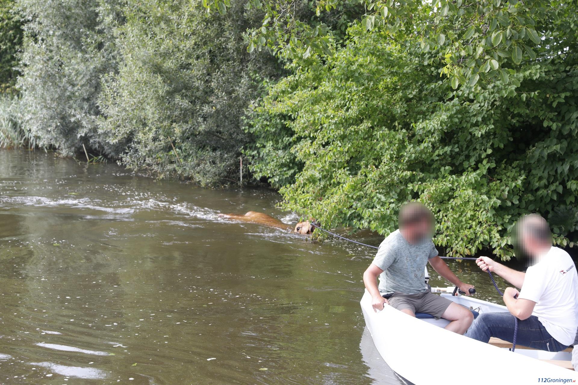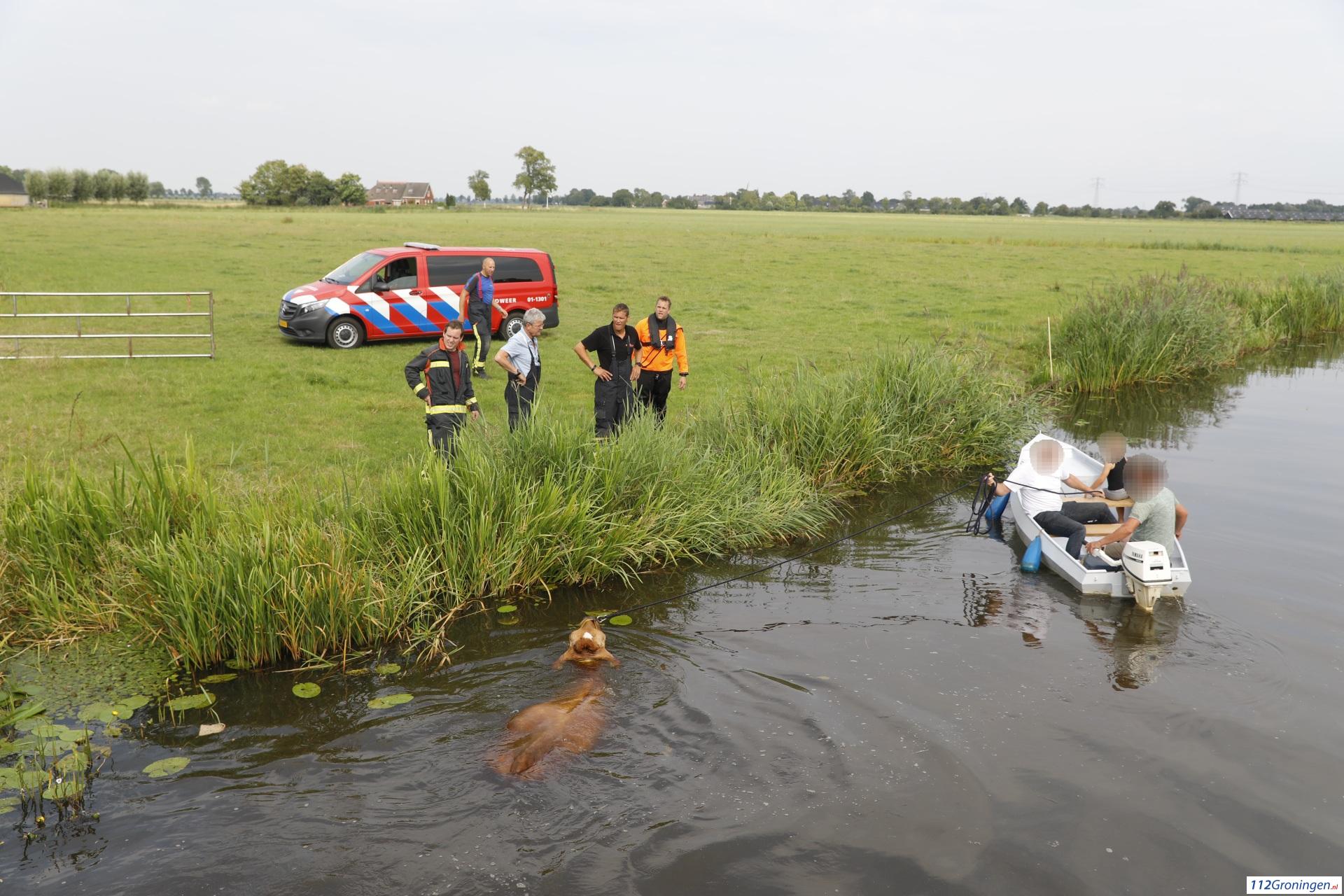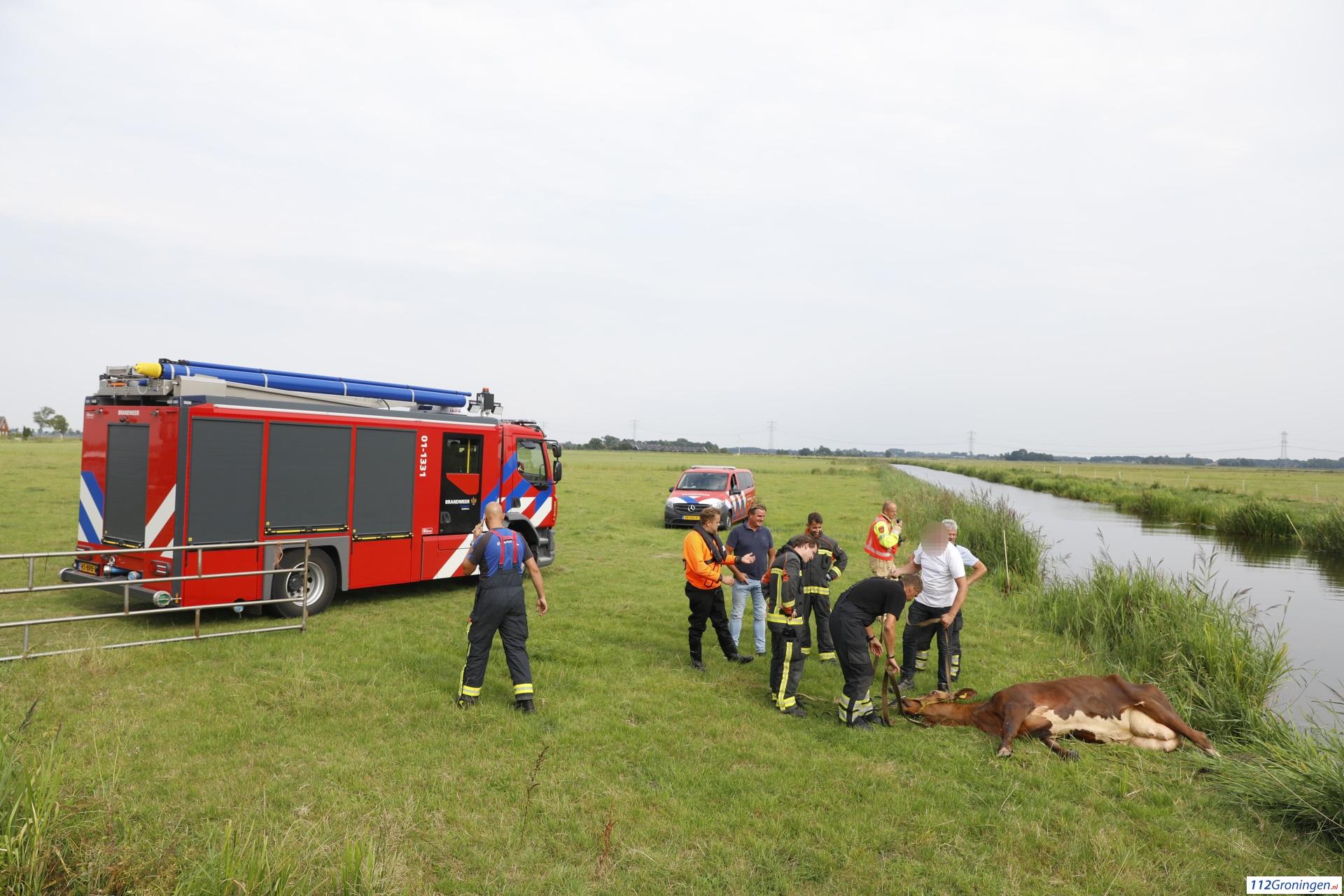 Bij het weiland is de koe er door de brandweer van Zuidhorn uit het water getrokken. De koe was vanwege de zwemtocht en de stress erg moe, na een paar minuten kon de koe weer op eigenkracht opstaan.