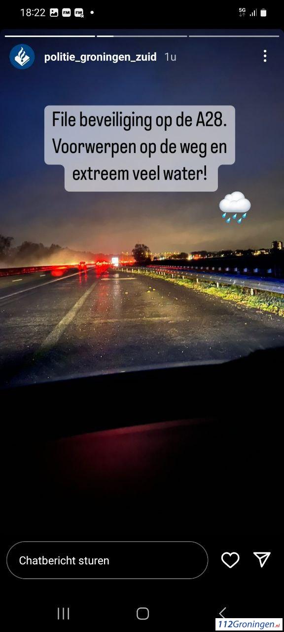 Groningen – Op de A28 bij Haren in de richting van Groningen is één rijstrook afgesloten wegens water op het wegdek. Dit komt doordat het water niet kan wegstromen in de put. Dat meldt RTVNoord.