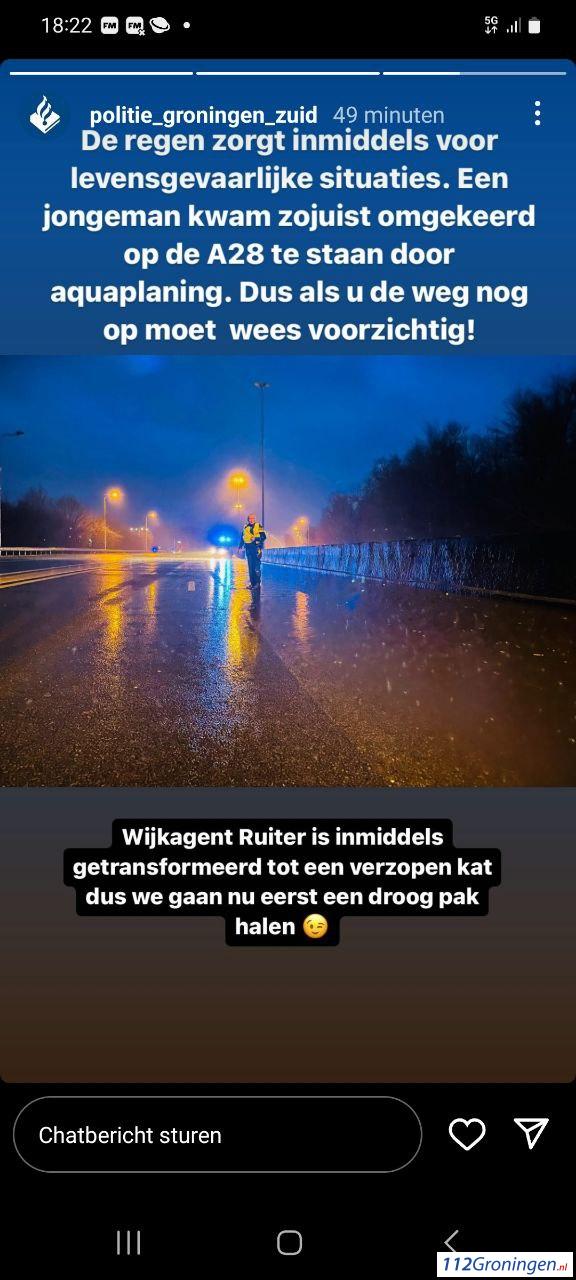Door het natte wegdek is rond 16:50 uur een eenzijdig ongeluk gebeurd. De politie schrijft op Instagram dat een jongeman omgekeerd op de weg belandde door aquaplaning.