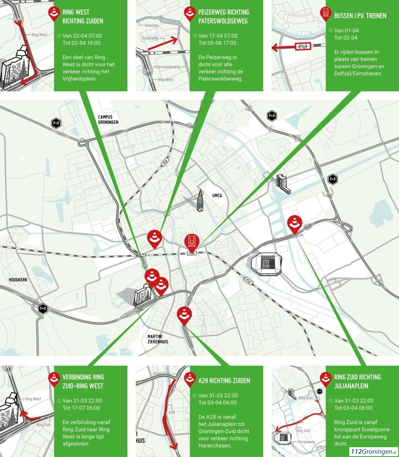 Behalve de afsluitingen die in de komende periode starten, zijn er ook lopende werkzaamheden die voor verkeershinder zorgen. Zo is de Noorderstationsstraat dicht voor alle verkeer. Op de Brailleweg is op dit moment een rijstrook dicht voor auto’s, daardoor kan je vanaf het Emmaviaduct niet de A28 oprijden. Verder is het Wouter van Doeverenplein, bij het UMCG, tot eind april dicht voor auto’s en bussen. Ook is hier het fietspad van de Petrus Campersingel in één richting dicht tot 19 juni. Bekijk de Slimme Kaart voor een overzicht van meer werkzaamheden.