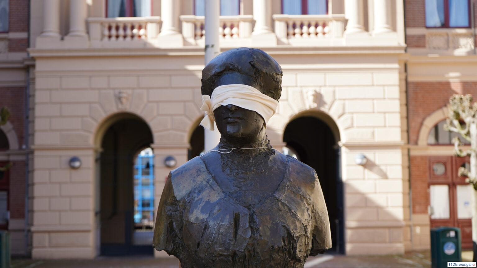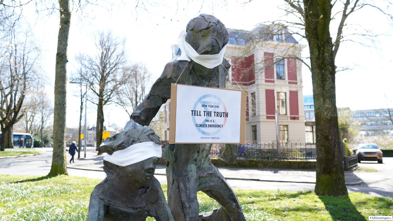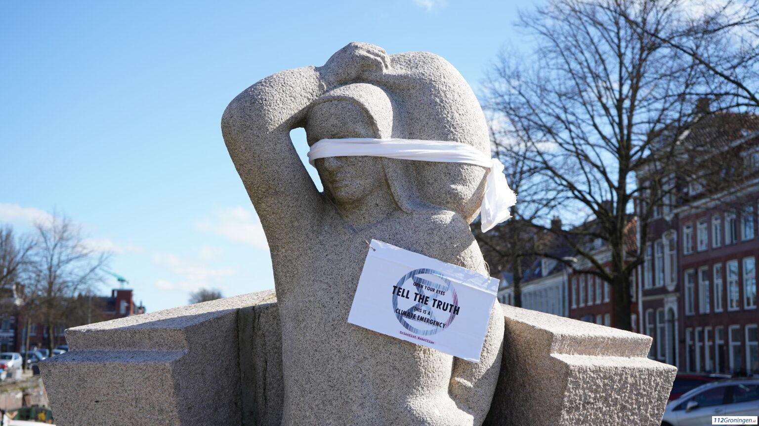 Groningen – In de binnenstad van Groningen heeft actiegroep Scientist Rebellion zondagmorgen standbeelden voorzien van een blinddoek.