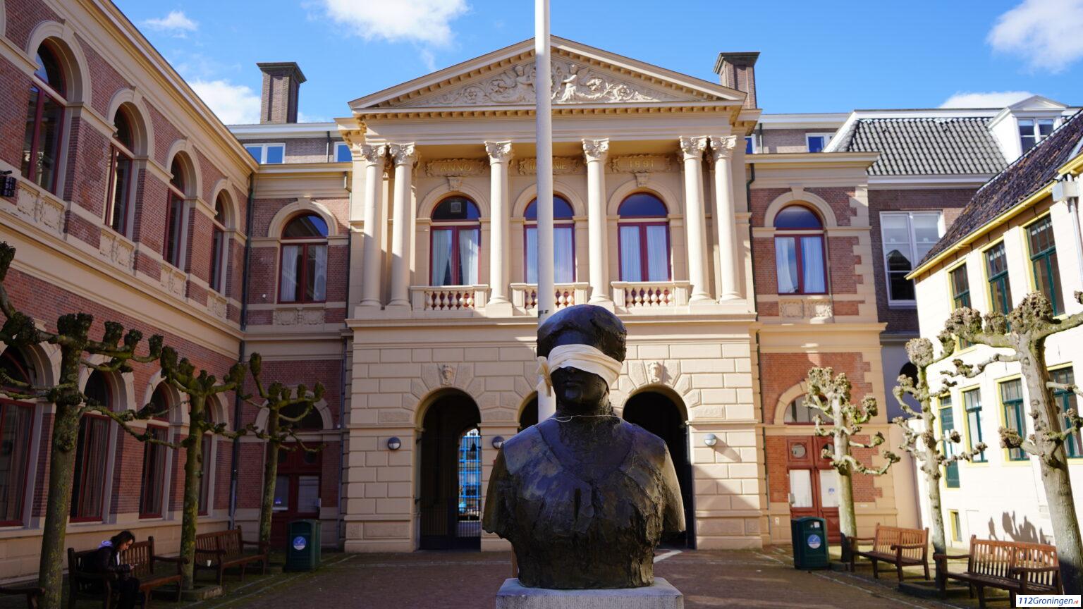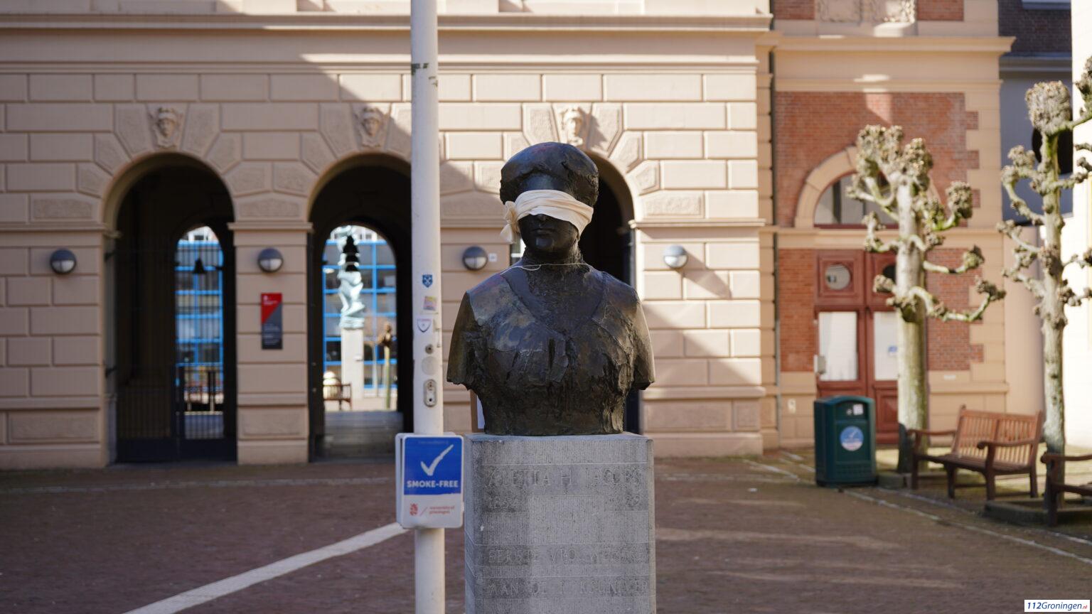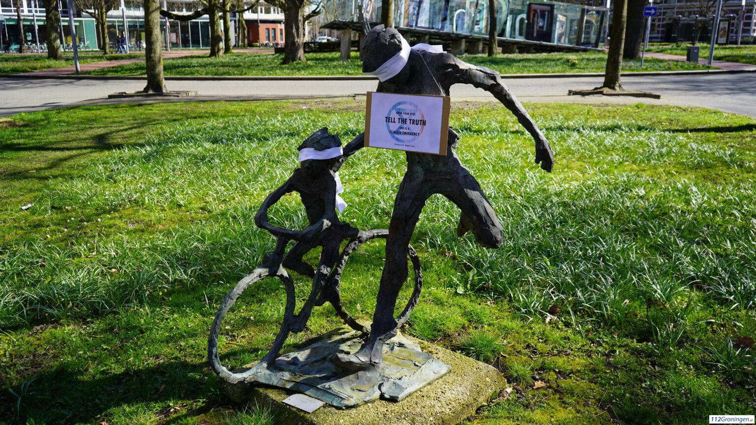 Groningen – In de binnenstad van Groningen heeft actiegroep Scientist Rebellion zondagmorgen standbeelden voorzien van een blinddoek.