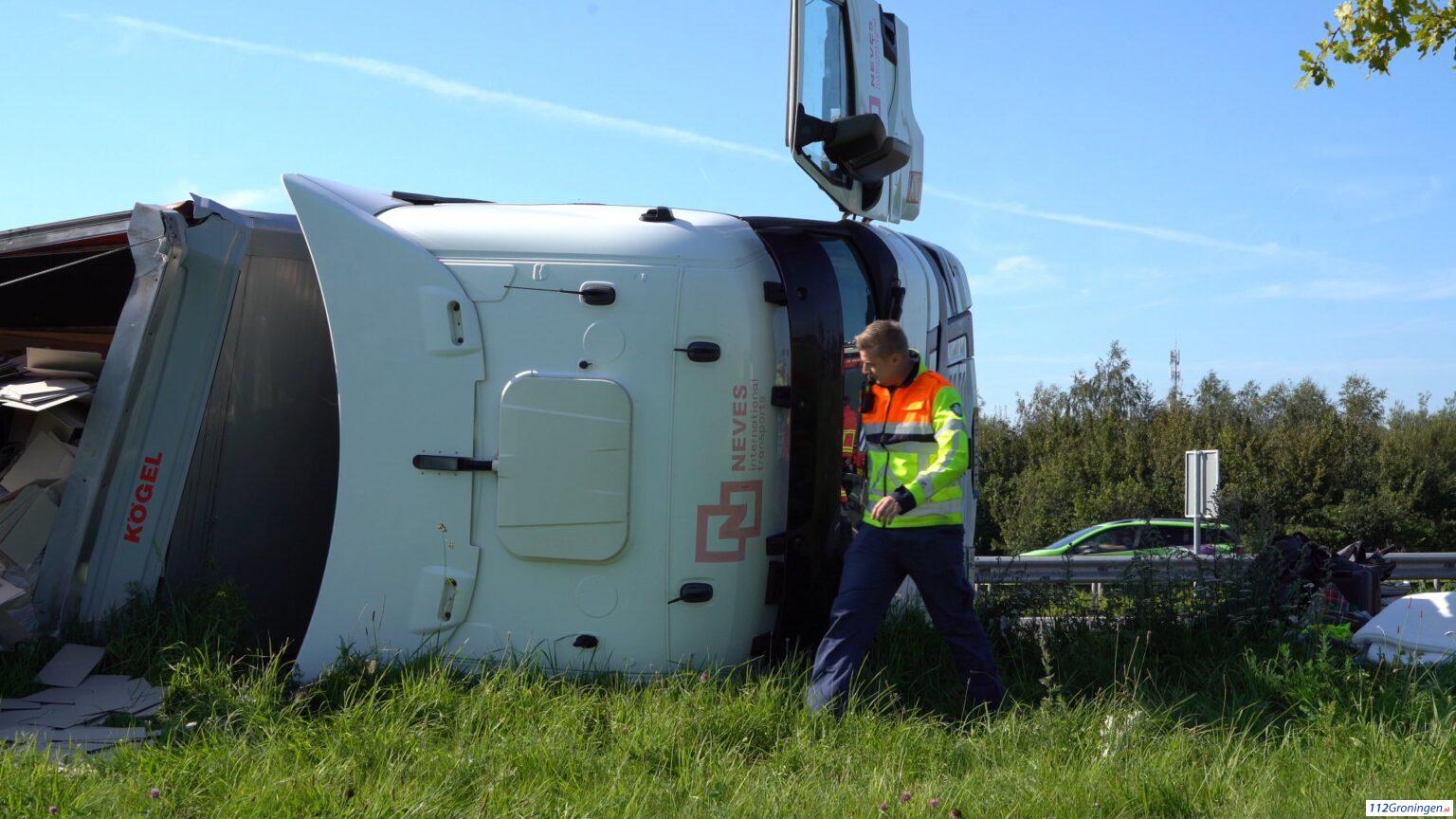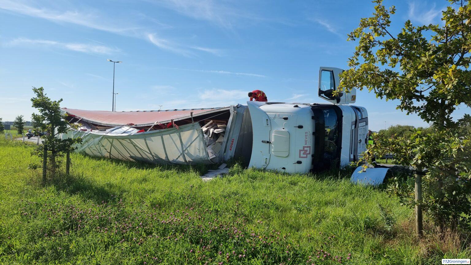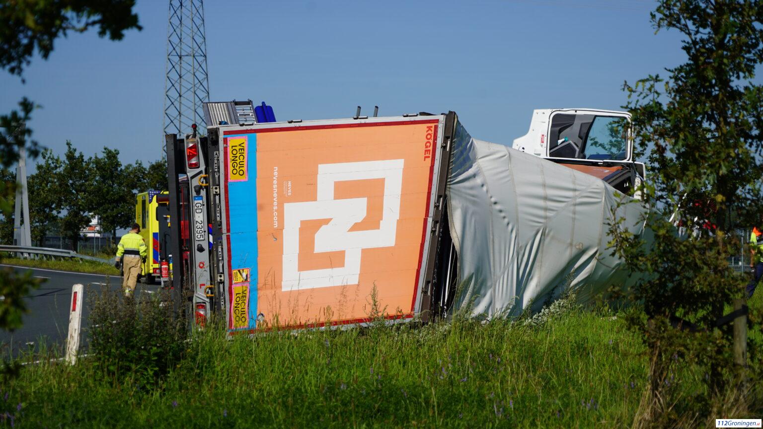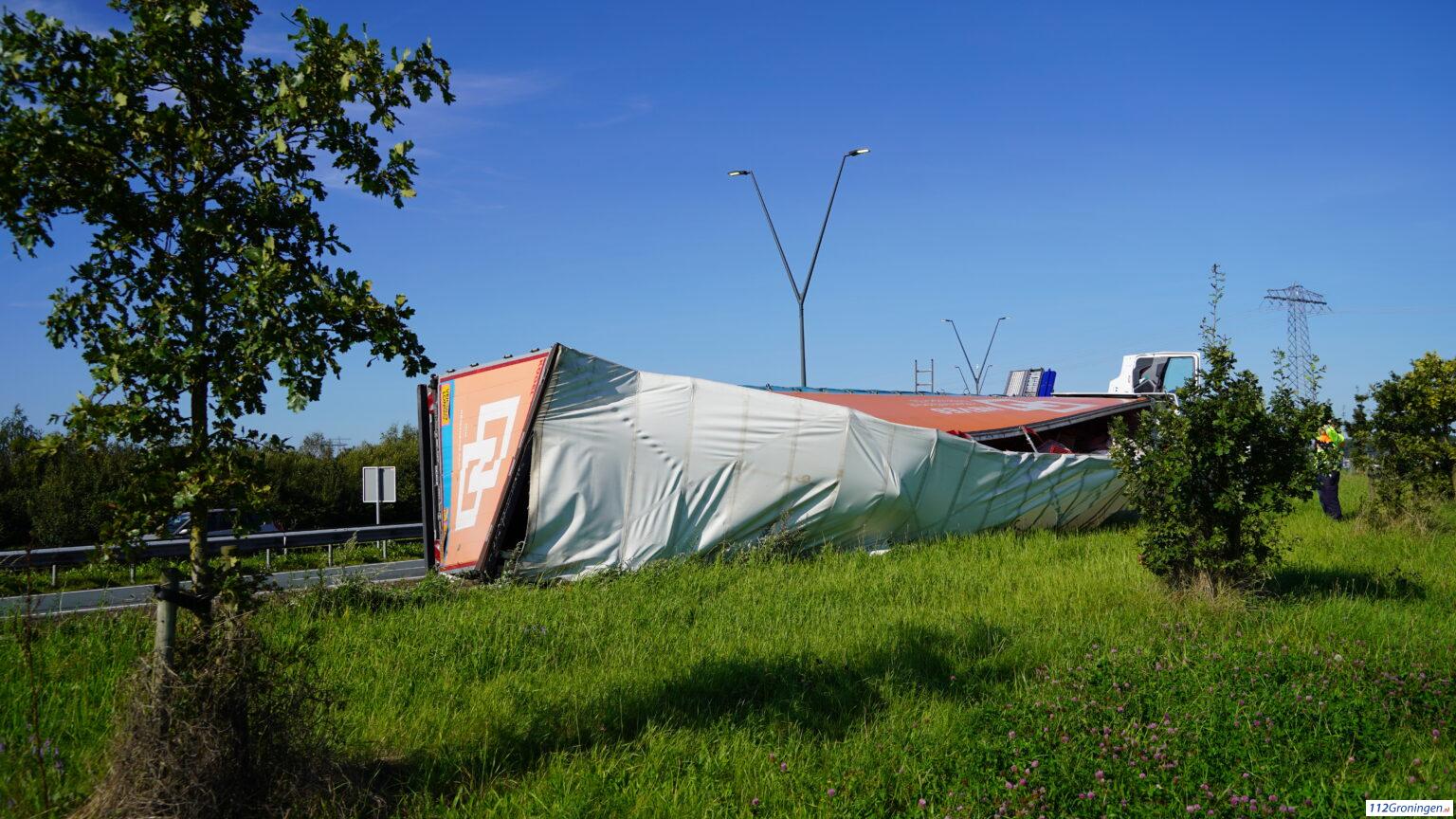Groningen – Op De N7(203.5) in de bekende bocht nabij Industrieterrein Driebond van Winschoten ri Stad is vrijdagmorgen rond 11:05 uur een vrachtwagen op de zijkant geraakt.