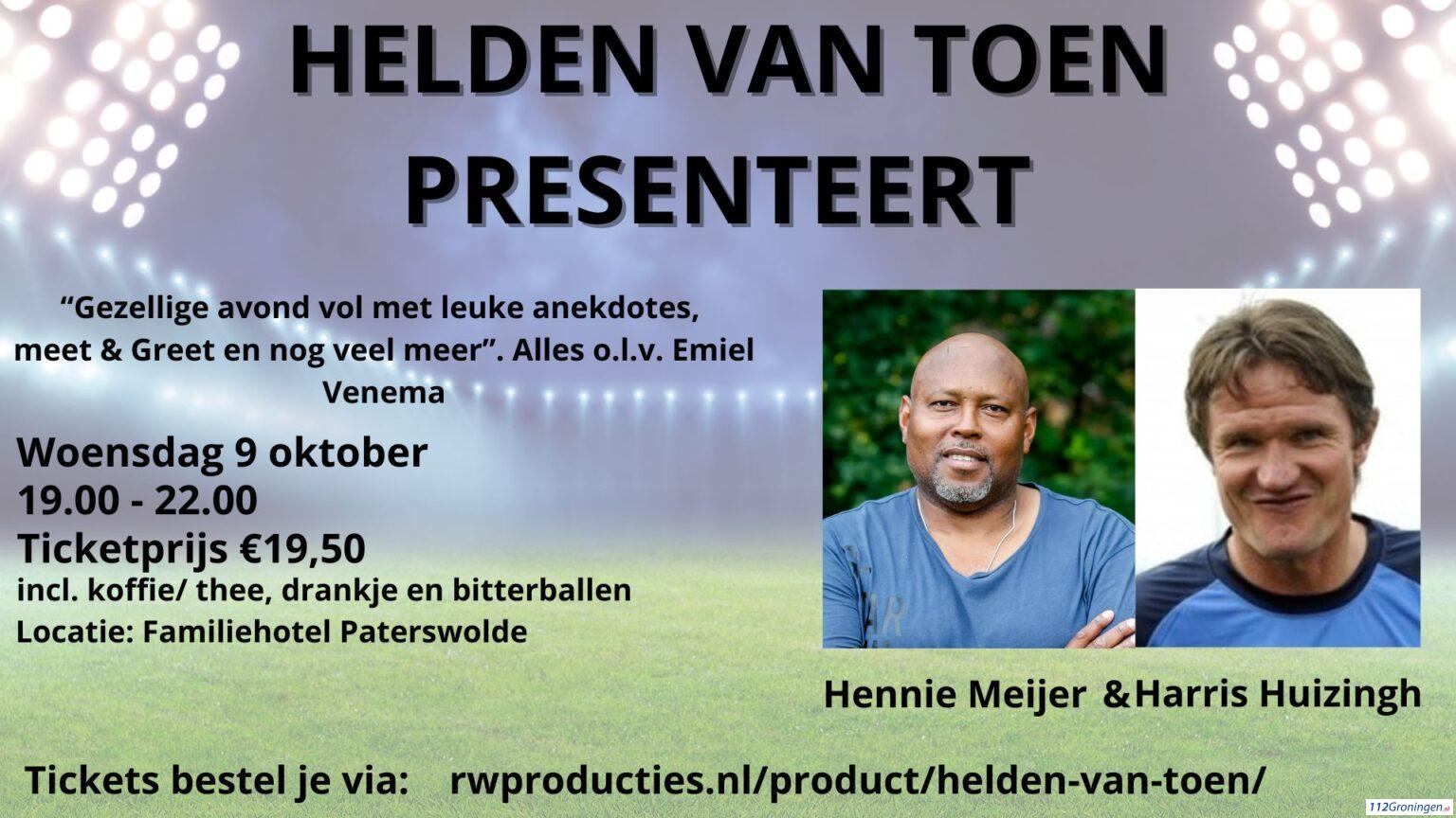 In de hoofdrol op woensdag 9 oktober in Paterswolde staan de legendarische spitsen Harris Huizingh en Hennie Meijer. Het spitsenduo, dat furore maakte bij FC Groningen in de jaren ’90, deelt hun mooiste herinneringen en persoonlijke anekdotes met de aanwezige fans. Het duo zal het publiek meenemen op een reis door de tijd, met verhalen die menig supporter weer kippenvel zal bezorgen.