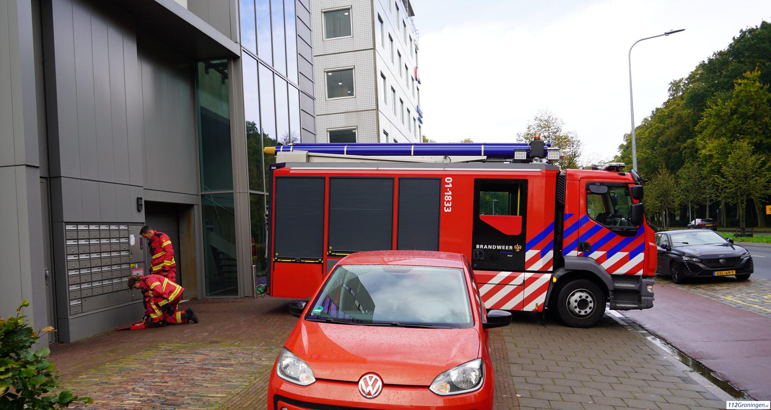 Groningen- In woontoren Pino Blanc aan de Hereweg had de brandweer maandagmiddag een kleine inzet. De brandweer was met gereedschap bezig om een klus te klaren.