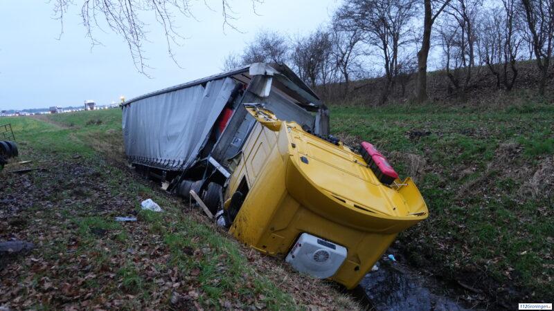 Westerbroek: Vrachtwagen belandt naast de A7 in een sloot (update)