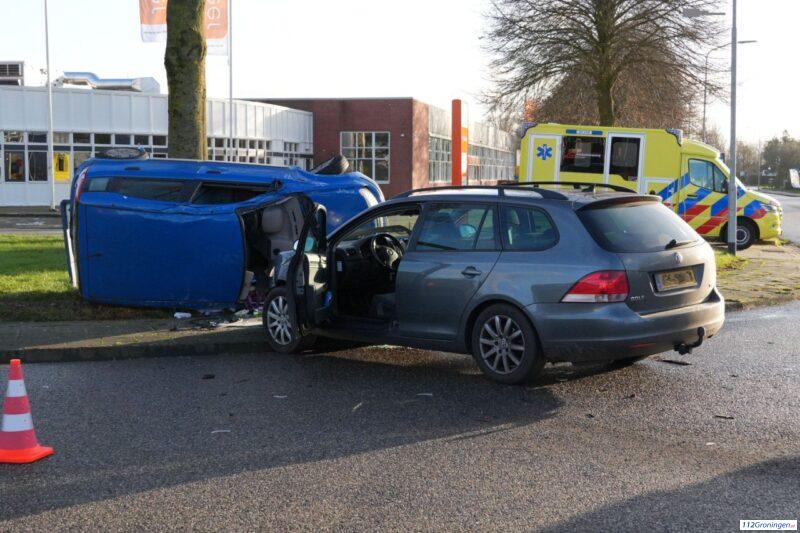 Auto op zijkant na aanrijding op A.J. Romijnweg in Winschoten