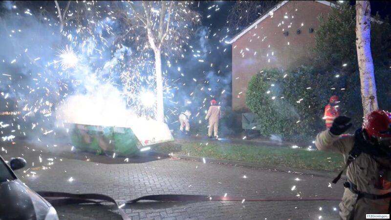 Brandweer springt weg van ontploffende vuurwerk in brandende container (Video)