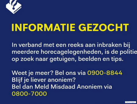 Groningen – In verband met diverse inbraken bij horeca gelegenheden in Groningen is de politie