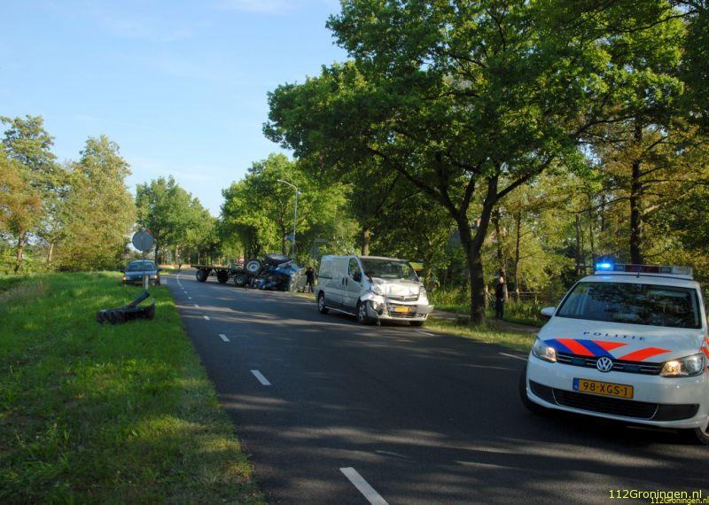 Bij een aanrijding raakten vanavond een busje en een tractor zwaar beschadigd.