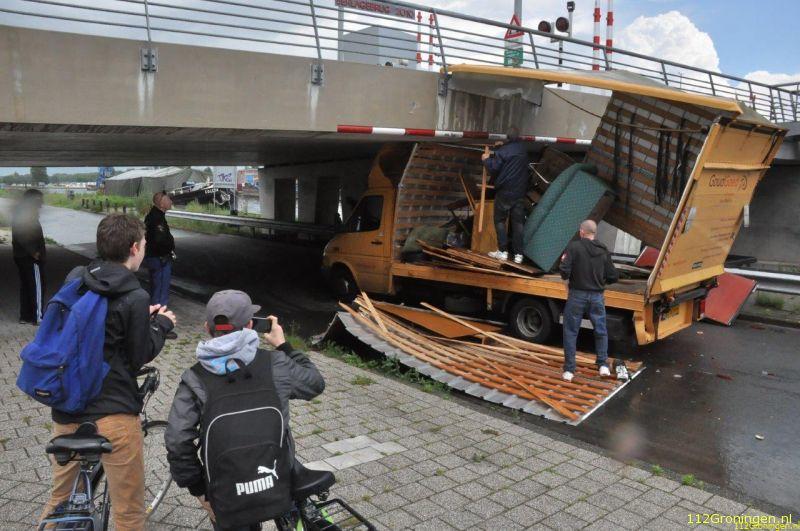 Om 14:50 uur is een auto van kringloopwinkel Goud Goed tegen het viaduct onder de