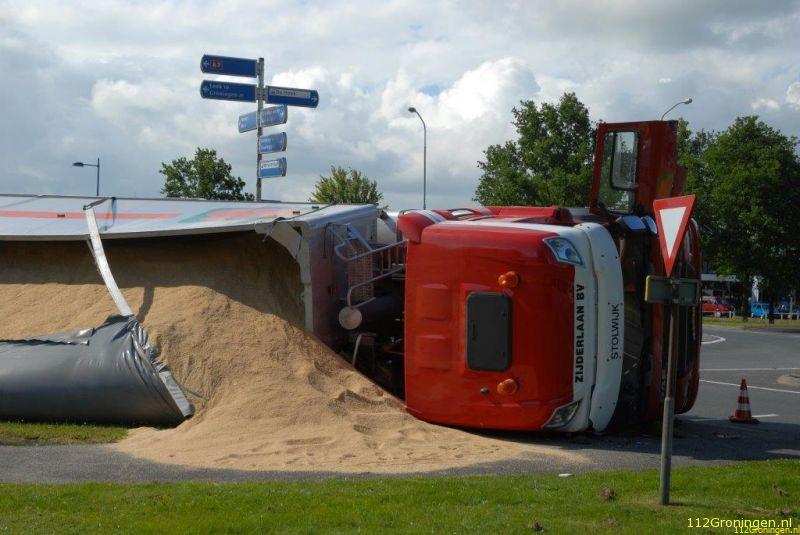Een vrachtwagen geladen met 34 ton soja is donderdagmorgen gekanteld op de rotonde bij de
