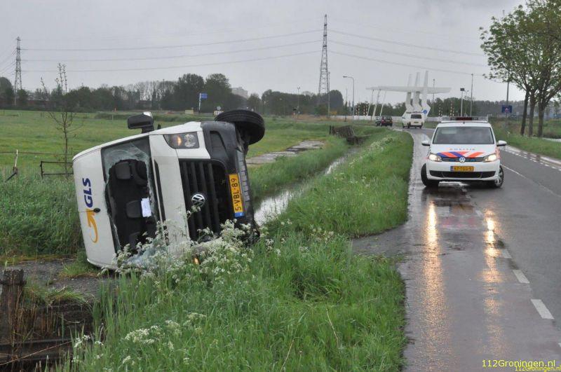 Een busje van GLS couriers is donderdagmorgen om 09:50 uur gekanteld op het Hoendiep vlak