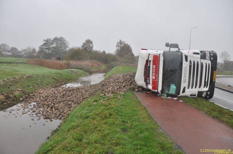 Bietenauto kantelt in Hoogkerk 1 km voor suikerfabriek (Video)