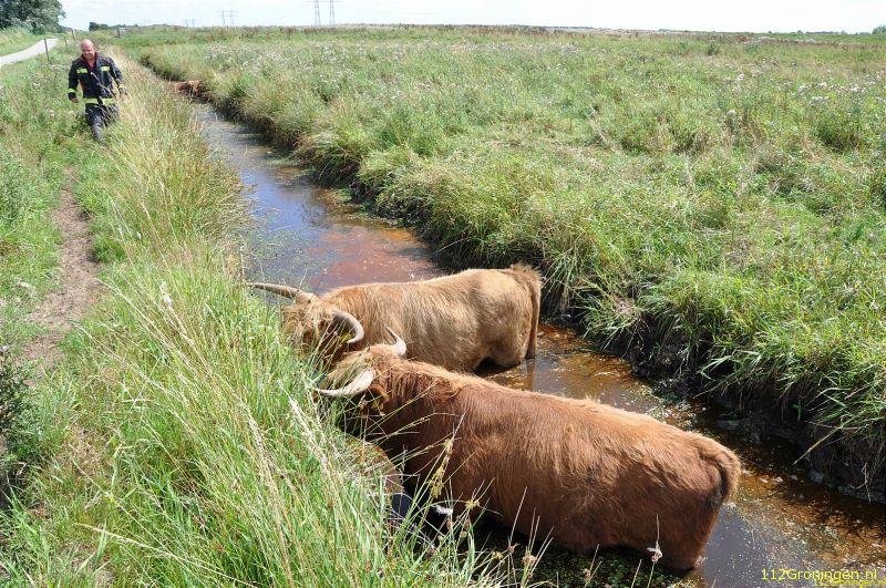 Drie schotse Hooglanders hebben zondagmiddag verkoeling gezocht in een sloot in het natuurgebied nabij de