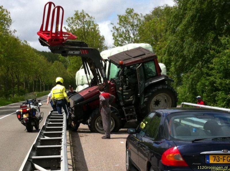 Trekker geschaard bij Mensingeweer. Een trekker met aanhanger, geladen met balen gras is maandagmiddag geschaard