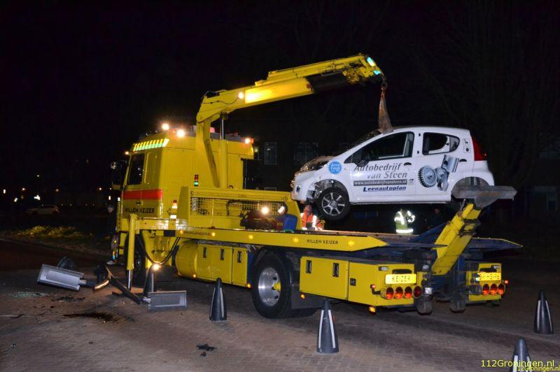 Zaterdagavond tegen kwart voor elf is een auto tegen een pinguïn en een lantaarnpaal aangereden