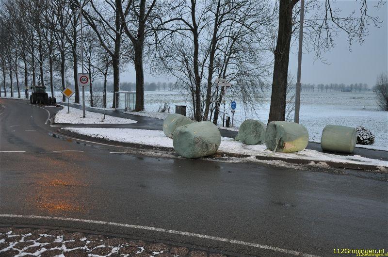 Aanhanger met strobalen kantelt bij Waterhuizen