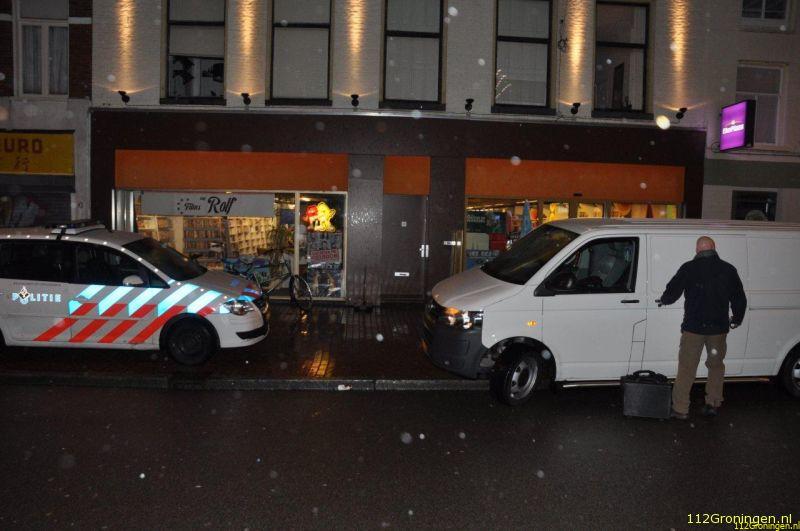 De politie doet onderzoek naar een overval op een videotheek in de Nieuwe Ebbingestraat in