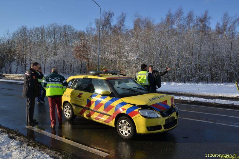 Woensdagmorgen zijn op de Geert Veenhuizenweg met de kruising N33 (afrit) twee voertuigen met elkaar