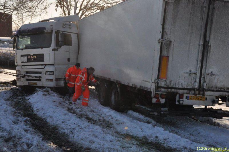 Donderdagmorgen al vroeg raakten diverse vrachtwagens van de weg. o.a bij ten Boer en op