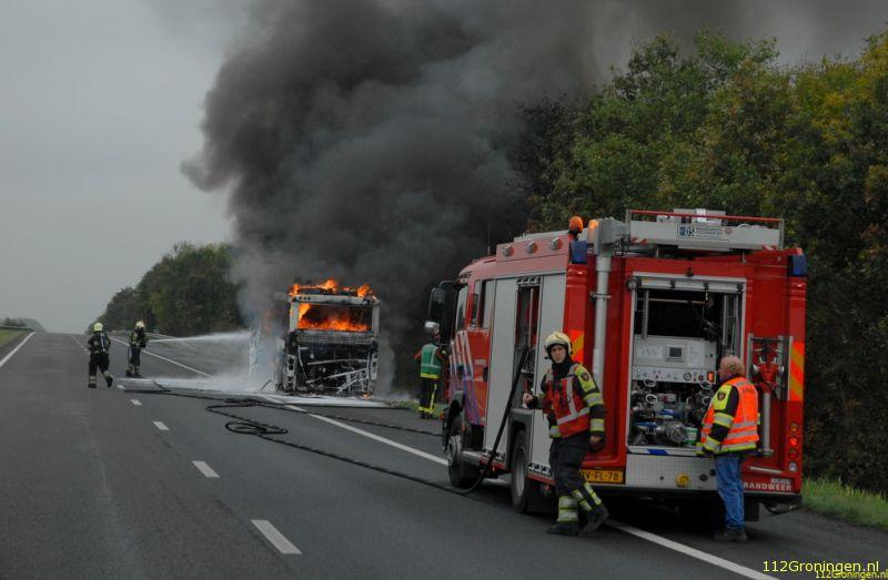 Een brand heeft vanmiddag op de A7 een Q-liner van Arriva verwoest.