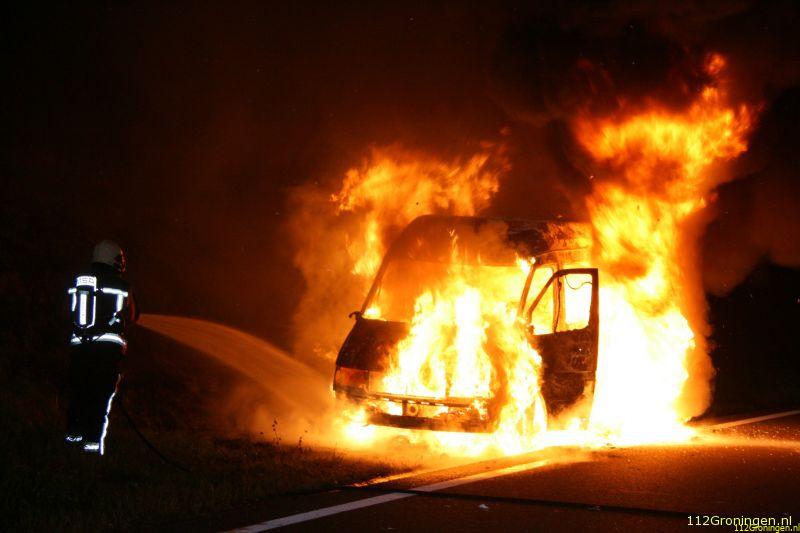 Zondagavond brandde een taxibus compleet uit op de afrit A7 thv Scheemda Zuid. De brandweer
