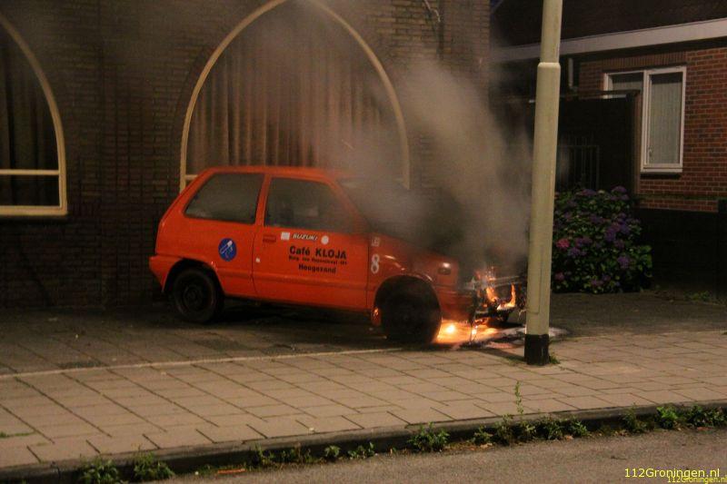 Een bij een cafe geparkeerde oranje gekleurde auto is in de nacht van zondag op