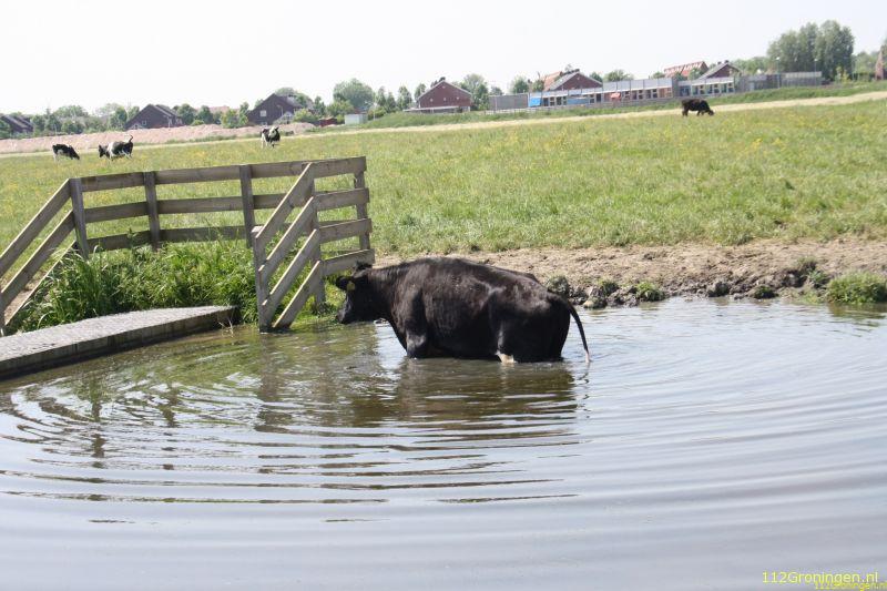 Koe neemt korte zwemles met de hitte