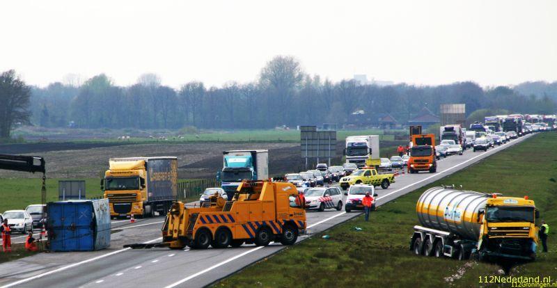 Een ravage vrijdagmiddag op de A37 bij het Drentse Hoogeveen toen een vrachtwagen met containers