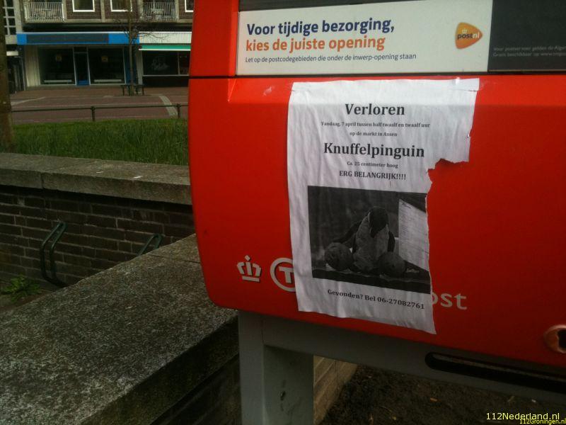 De politie in Assen is op zoek naar een knuffel pinguïn die een 10 jarig