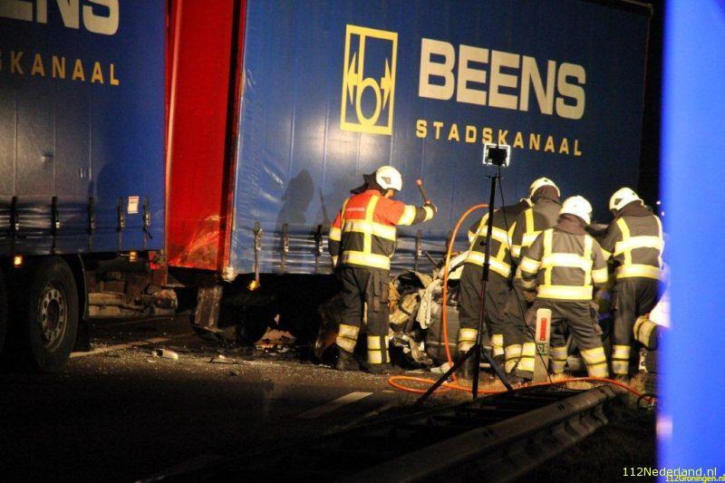 Persoon rijdt met hoge snelheid onder oplegger, persoon overleden