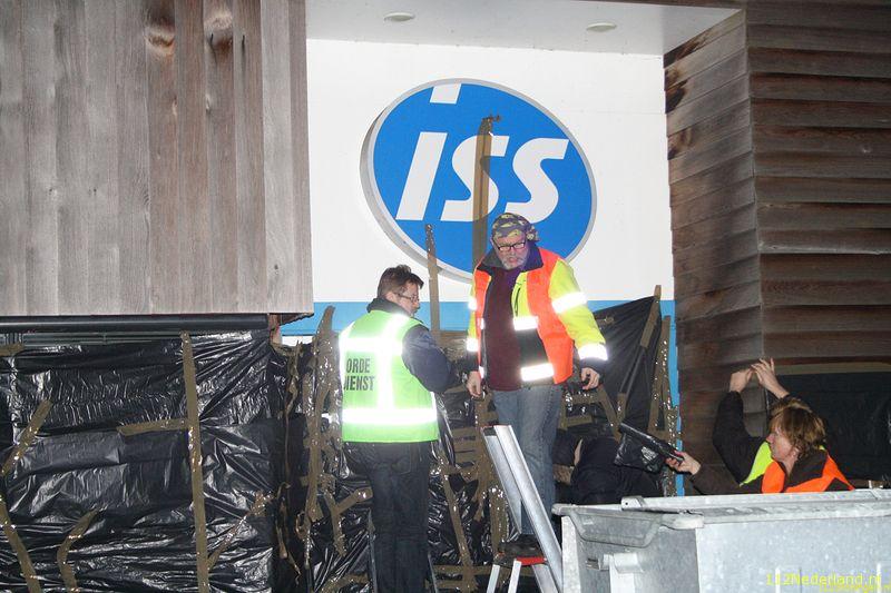 Stakende schoonmakers hebben maandagavond als ludieke actie het pand van hun werkgever ingepakt met vuilniszakken.