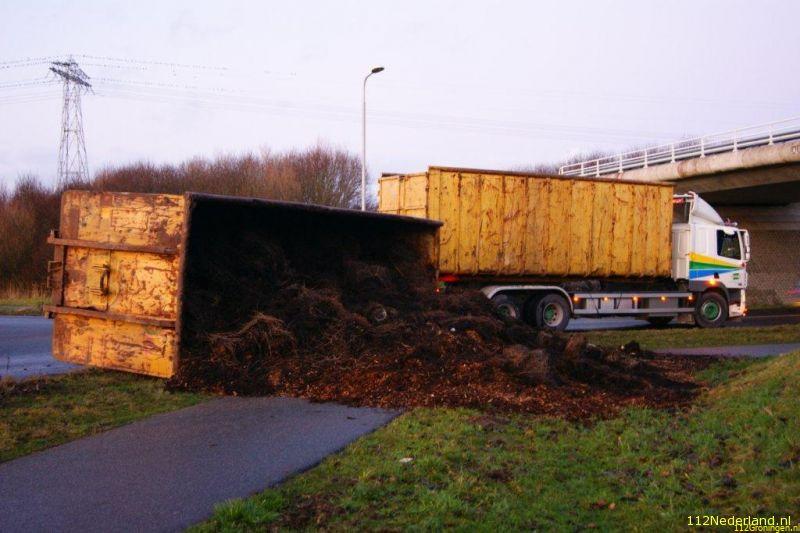 Een aanhanger van een vrachtwagen is maandagmiddag door nog onbekende oorzaak gekanteld op de rotonde