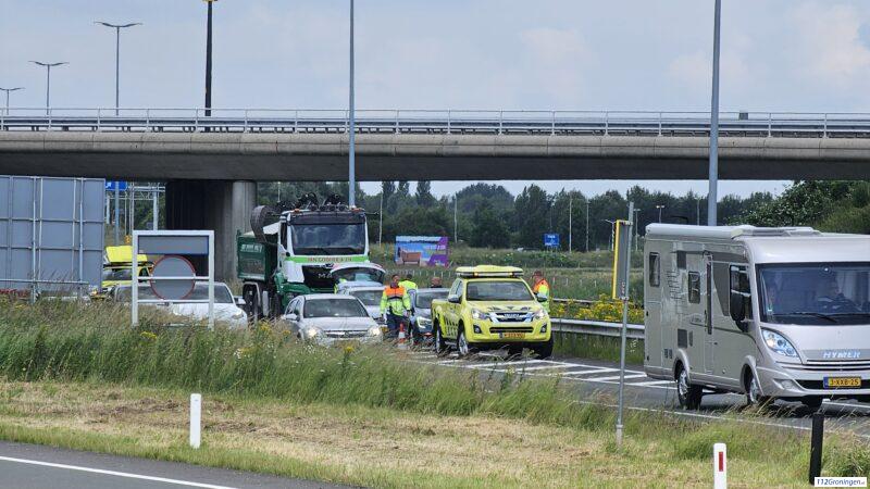 Groningen- Op de N46 naar de N7 bij knooppunt Euvelgunne heeft een kop staart aanrijding