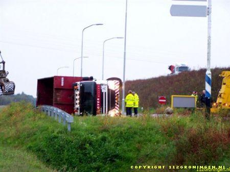 Vrachtwagen valt om op nieuwe rotonde bij rode loper