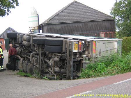 Vrachtwagen geladen met veevoer kanteld bij Oostwold