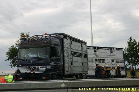 Zuidbroek – Door nog onbekende oorzaak is een vrachtauto met koeien geschaard op de A7