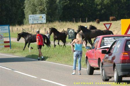 Een zestal paarden die er in slaagden uit hun weiland aan de Lauwerseewei bij Dokkumer