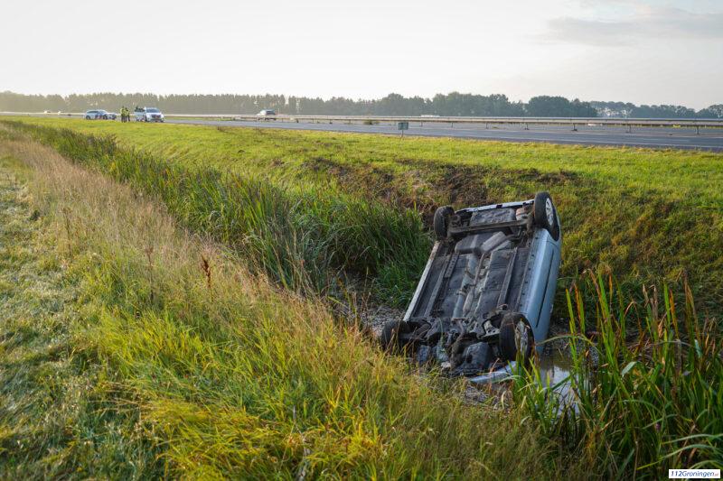 Auto belandt op de kop in sloot langs A7 bij Groningen