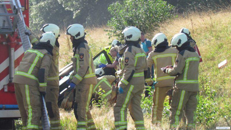 Auto met drie inzittenden glijdt van afrit A7 en belandt op de kop in de berm