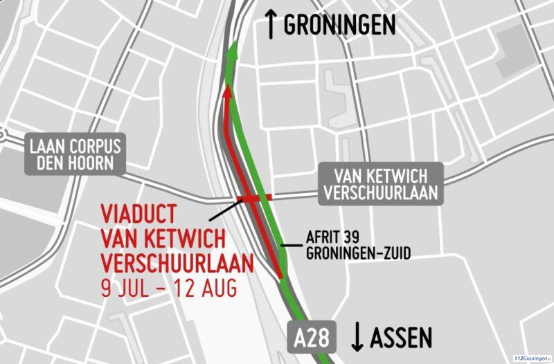 Groningen – Vanwege werkzaamheden aan de A28 is de Van Ketwich Verschuurlaan onder de A28