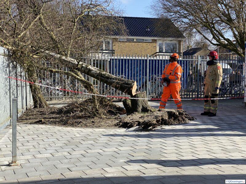 Boom omgezaagd door brandweer vanwege gevaar bij school in Uithuizen
