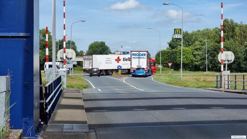 Hoogezand – Door een stilstaande vrachtwagen bij de rotonde aan de Kerkstraat in Hoogezand ontstaat