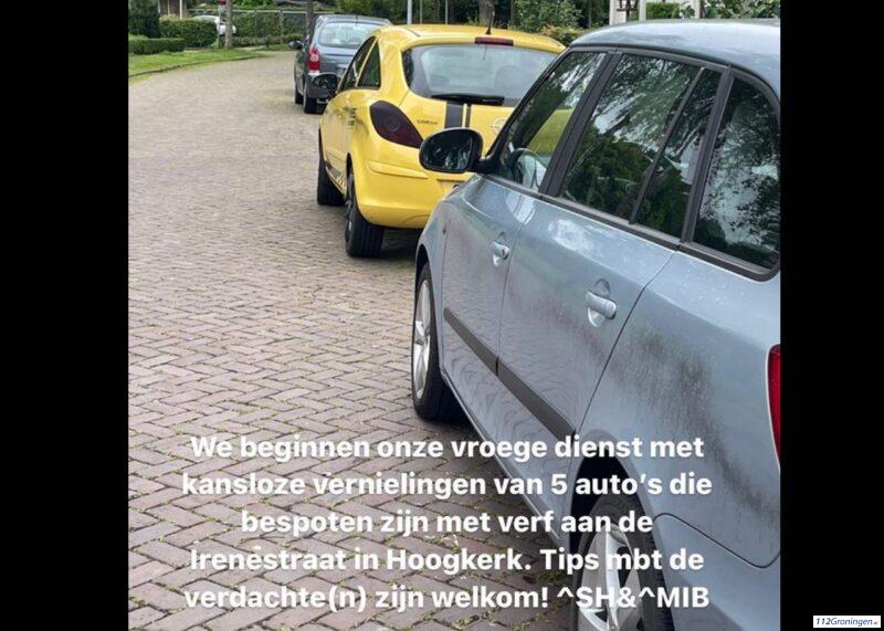 Hoogkerk – In Hoogkerk zijn in de nacht van zaterdag op zondag vijf auto’s bespoten