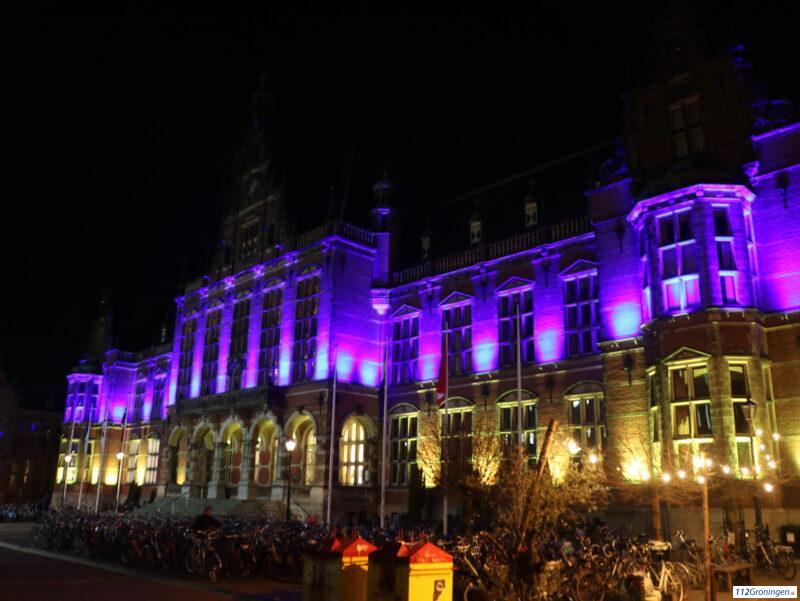 Groningen – Het Academiegebouw van de Rijksuniversiteit Groningen kleurt ook maandagavond blauw geel, de kleuren