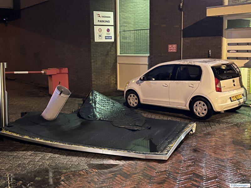 Storm: Deel van dak waait op auto Marktstraat Delfzijl