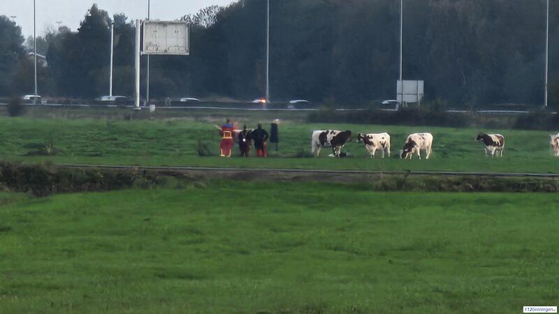 Groningen- Op een weiland aan de Rijksstraatweg is maandagavond een koe in een sloot beland.