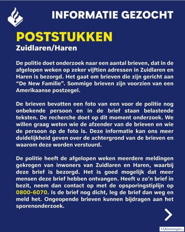 Haren / Zuidlaren – De politie doet onderzoek naar vreemde brieven die de afgelopen weken