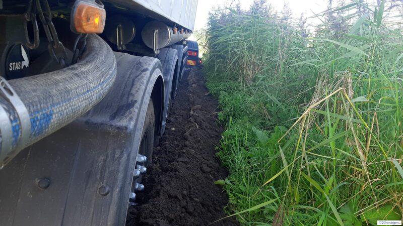 Vrachtwagen (50 ton) zakt weg in berm Gaarkeuken